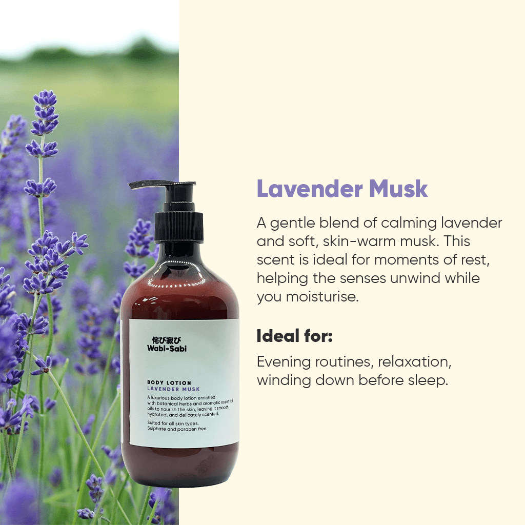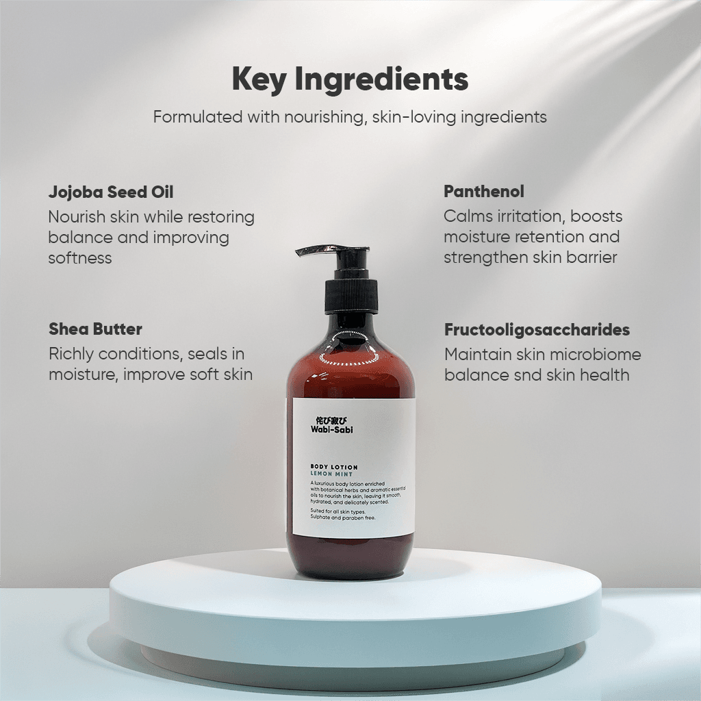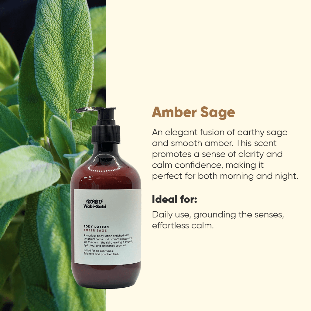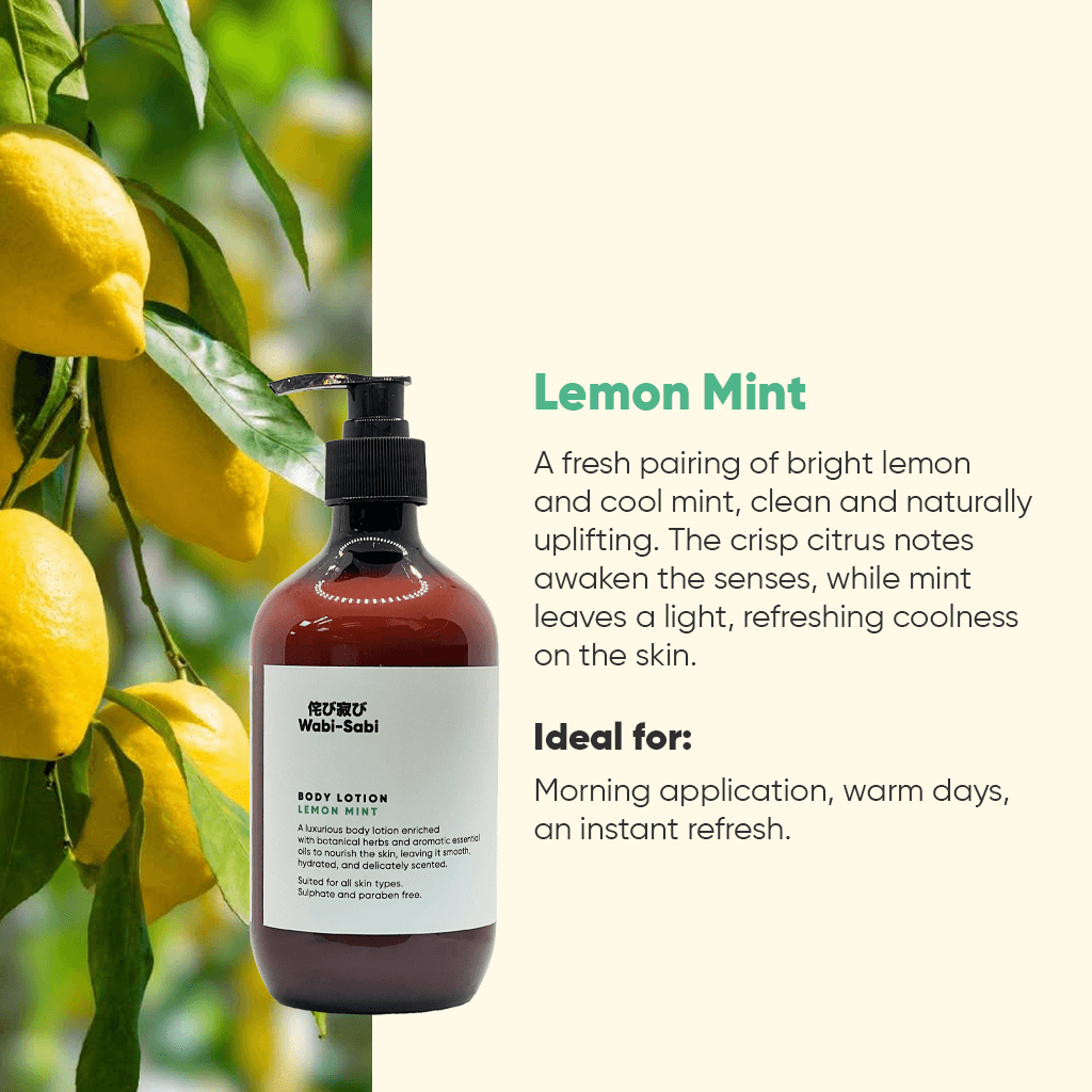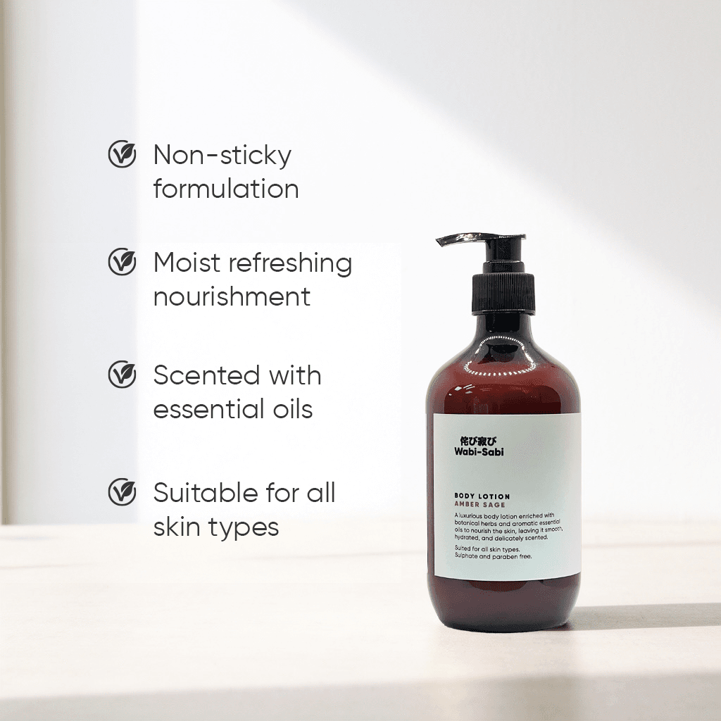 Hydrate and nourish your skin with our lightweight, non-sticky Wabi-Sabi Body Lotion. Made with plant-based ingredients and infused with essential oils for 3 scent choices: Lavender Musk, Amber Sage, and Lemon Mint. Enriched with Centella Asiatica, Tea Tree, Jojoba Oil, Panthenol, and Shea Butter to soothe, moisturise, and keep skin soft, smooth, and refreshed.